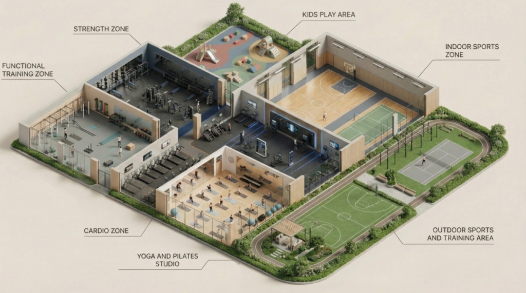 We design comprehensive Sports, Fitness & Recreation Hubs tailored to your needs. Our services include creating state-of-the-art gyms, professional-grade sports courts, engaging kids play areas, modern toilet cubicles, and relaxing steam & sauna baths.